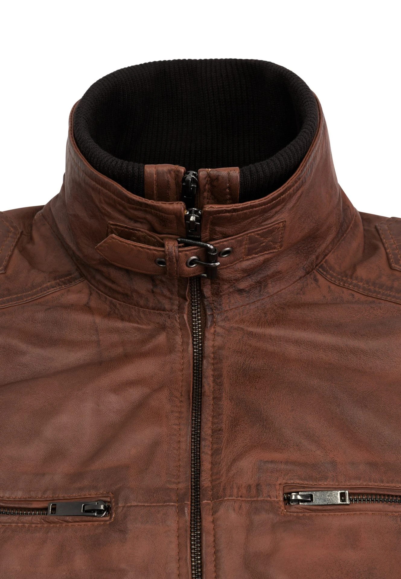 This leather jacket has also two inside pockets: one with a zipper, and one without a zipper.